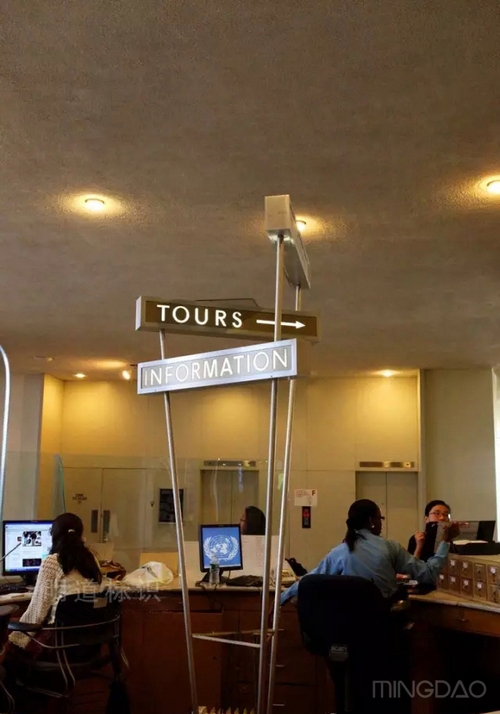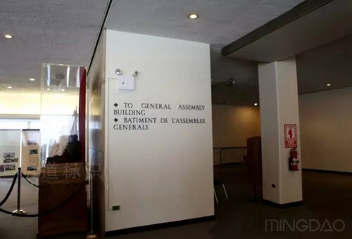 相結合的方式,這和聯合國總部大樓內眾多的活動息息相關。同時標識設置主要采用貼墻的方式,能減少占用空間,更好的起到人流引導的作用。