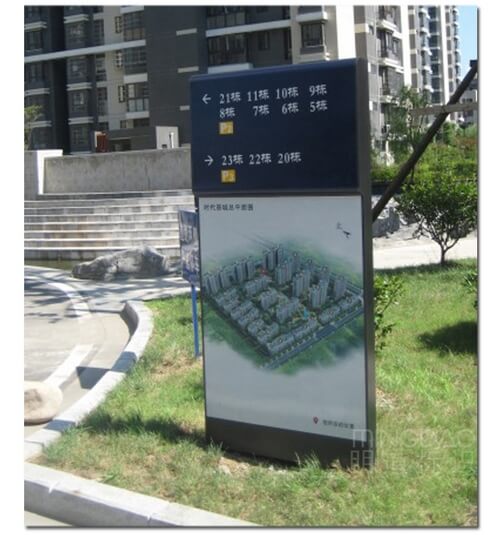 時,運用簡潔、現代、大氣的色調與形狀,將建筑格局及服務功能有效指引導示,讓人一目了然,為該樓盤營造出了快捷便利的生活感。