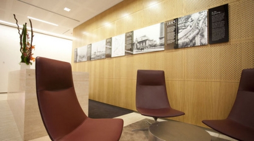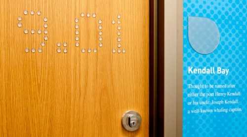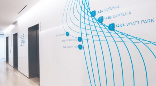 ,還是企業形象畫面,都以水滴為核心概念節節貫穿。在這里,可以看出設計師對材質的駕馭力。同是水滴概念,但在不同地方,設計師都因地制宜,用了不同的材質、不同的色彩。讓整套導視系統很豐富,很耐看。