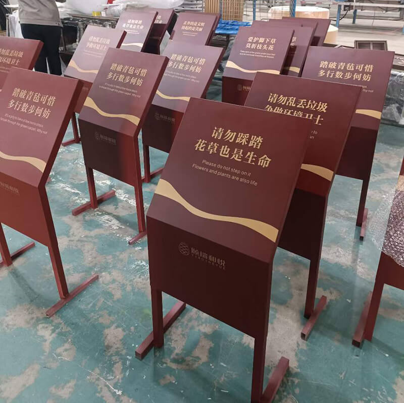 警示標識牌一般分為安全警示牌、禁止性警示牌、公德提醒牌,如“請勿戲水”、“禁止翻越”、“嚴禁煙火”、“嚴禁高空拋物”等,安全警示和禁止性警示一般都有標準的圖形符號和標準的語言,公德提醒牌內容則多為自撰,語言忌諱生硬。