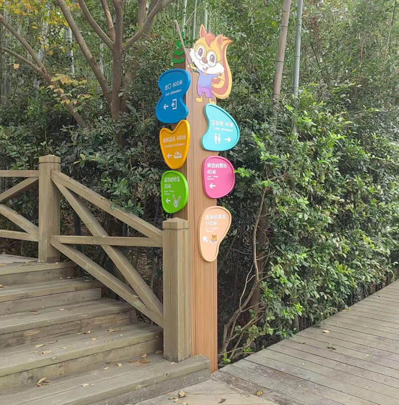 我們對旅游標識的設計,需要依據旅游區環境的不一樣氛圍而設計出不一樣的標識風格。園區所采用的標牌材料可以是選用純天然的木料創作的,相較別的經由加工的材質,原生態木材標示牌流露出親切感。木質紋路細膩,色彩的搭配鮮艷活躍,一切的設計和周圍氛圍相融合。