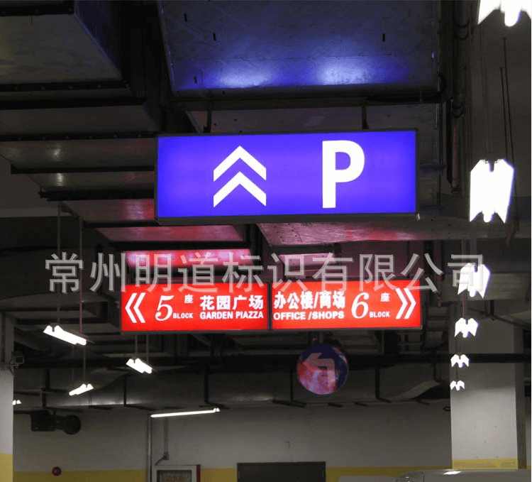 首先,車庫標識要求導視功能性強,能讓過往車流能第一時間找到想去的地方,一般選用工程級反光膜,或自發光燈箱來做為引導標識;其次車庫標識要求系統性,多種型式的標識牌組合成一個成套的成體系的系統,布點明確,引導性強。