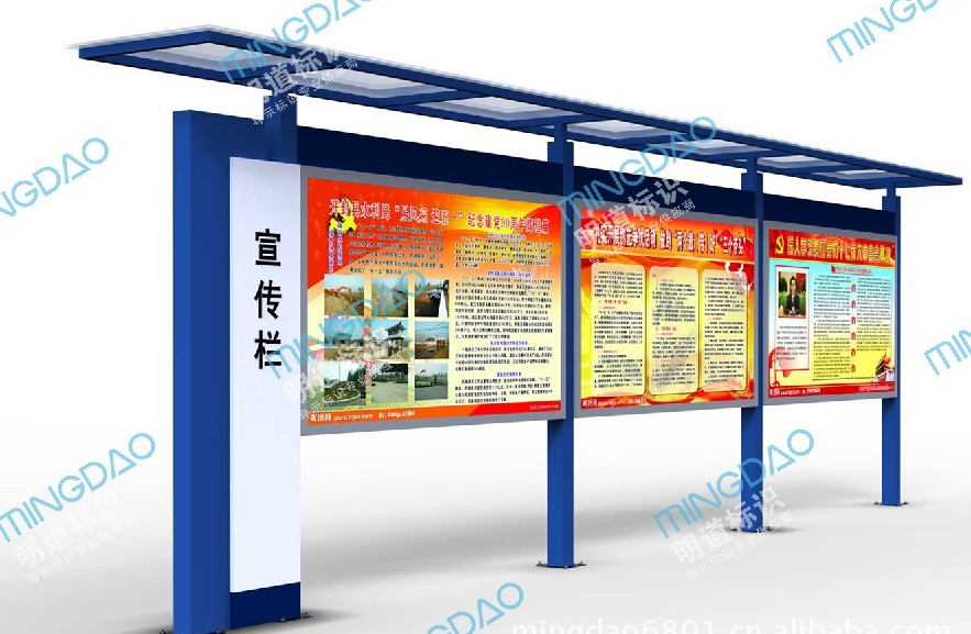 【產(chǎn)品介紹】 宣傳欄,是組織或企業(yè)單位等進行自我宣傳的有效手段。它常被應(yīng)用于街道,工廠,小區(qū),酒店等公共場所,采用不銹鋼或鍍鋅板為框架,鋼化玻璃或者耐力板為面板,鋁合金為頂棚,面板可以打開更換宣傳畫面。