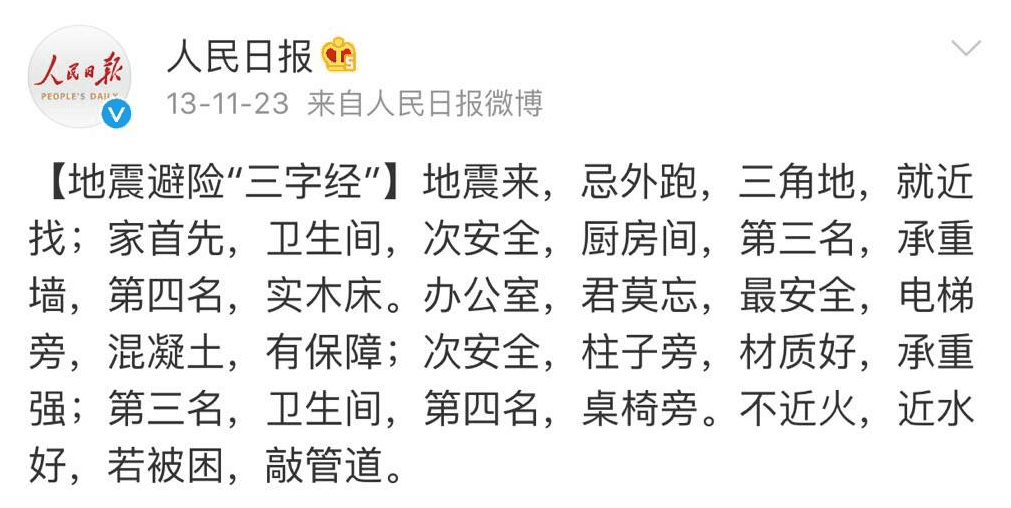 地震來了千萬不要慌張,要穩定自己的情緒,尋找穩固的躲避區,并注意保護自己的頭部。國際通行的地震逃生原則“蹲下、掩護、抓牢”,到目前仍然是有效的。當房子晃動的時候,可以躲在安全的地方,等待不晃的時候往下一個地點轉移,在下一波震動來襲之前,躲在新的可藏身的安全之處。