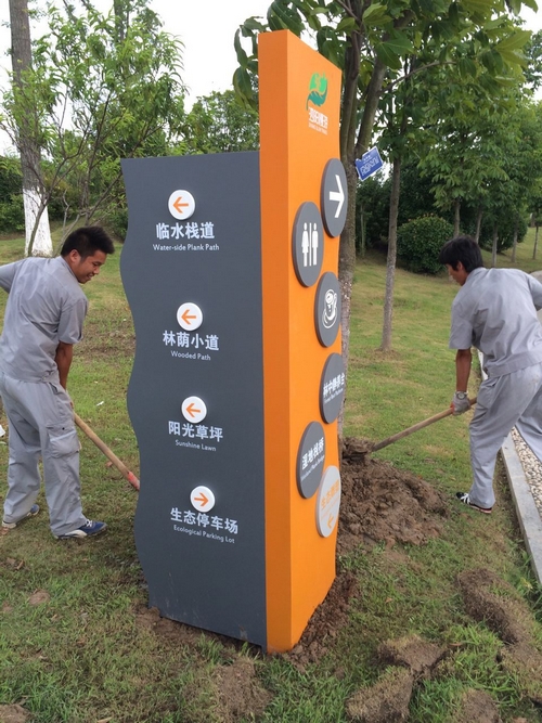 指示牌是從游客角度出發(fā),對園區(qū)內(nèi)各個景點、公共設(shè)施及服務(wù)設(shè)施的方位及線路指示。包括方位指示牌與場所標(biāo)識牌。而這是互相配合的,對必須標(biāo)識的場所進行標(biāo)識,有利于提高公園的服務(wù)效率。