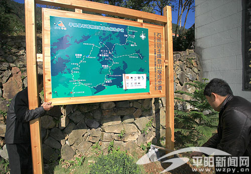 石城明王峰日前安裝了規范的登山探險步道標識牌,今后登山者在石城明王峰登山,再也不會因標識不清而中途返回了。據了解,明王峰海拔1078米,是南雁蕩山最高峰,上山可觀日出,是一個休閑健身、野外露營探險的好去處。圖為新安裝的明王峰步道標識牌。
