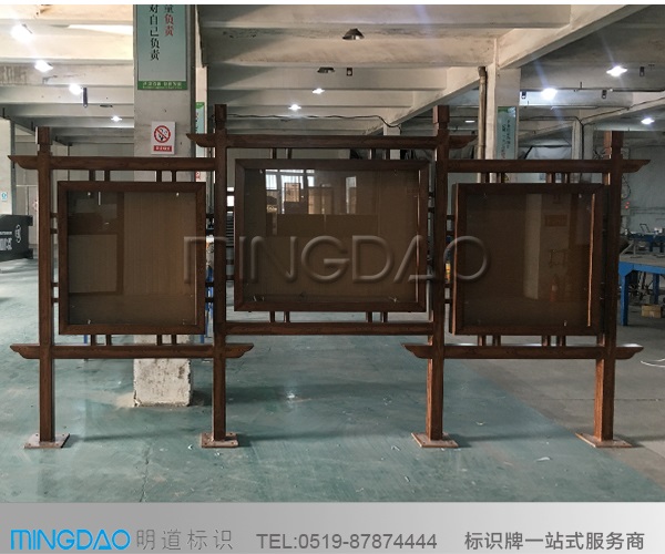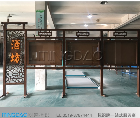宣傳欄是明道標(biāo)識為酒坊村設(shè)計(jì)制作的宣傳招牌,展現(xiàn)了酒坊的歷史變革、釀酒工藝和人文情懷。木紋漆具有很好的仿古效果,搭配鈑金材料,讓這套標(biāo)識牌既具有防潮、防腐、防蛀、防銹、耐高溫、易清理、色彩亮麗不脫色的性能優(yōu)勢,在外觀效果上也能達(dá)到防腐木標(biāo)識牌的歷史厚重感。